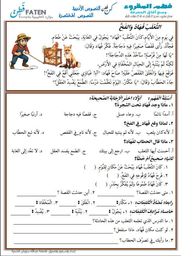 الثعلب فهاد والفخاللغة العربية, النصوص الأدبية المختصرة / بواسطة alshihi@live.com الثعلب فهاد والفخ تفاعلي FOMS ” أضغط هنا “ فهم المقروء للنصوص الأدبية المختصرة فهم المقروء للنصوص الأدبية المختصرة الثعلب فهاد والفختنزيل