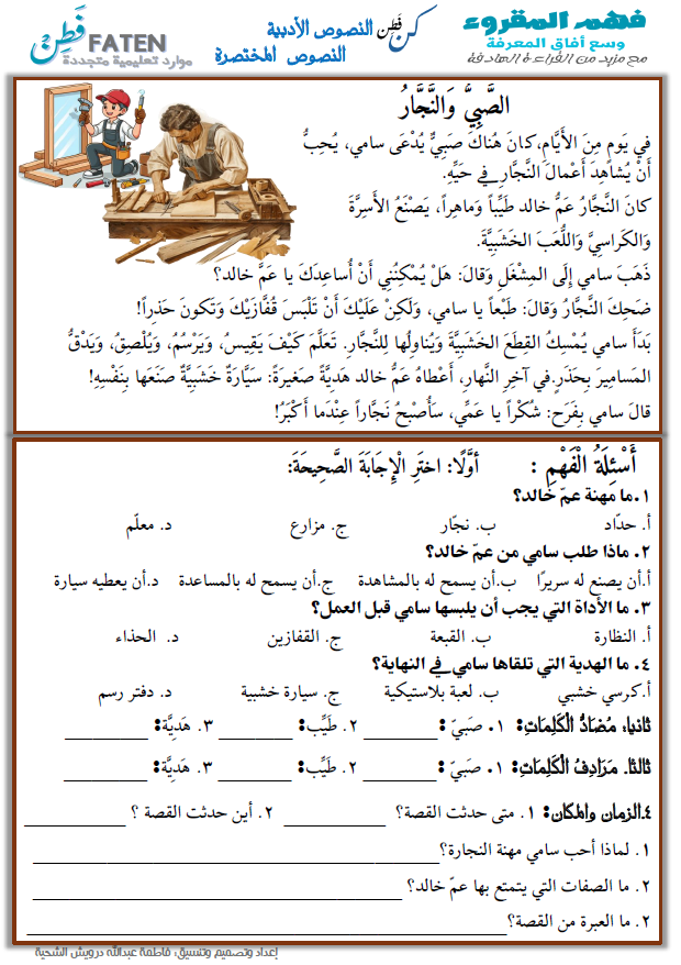 الصبي والنجاراللغة العربية, النصوص الأدبية المختصرة / بواسطة alshihi@live.com الصبي والنجار تفاعلي FOMS ” أضغط هنا ” فهم المقروء للنصوص الأدبية المختصرة فهم المقروء للنصوص الأدبية المختصرة الصبي والنجار أضغط على النص للمشاهدة أضغط على الإيقونة للتنزيلتنزيل