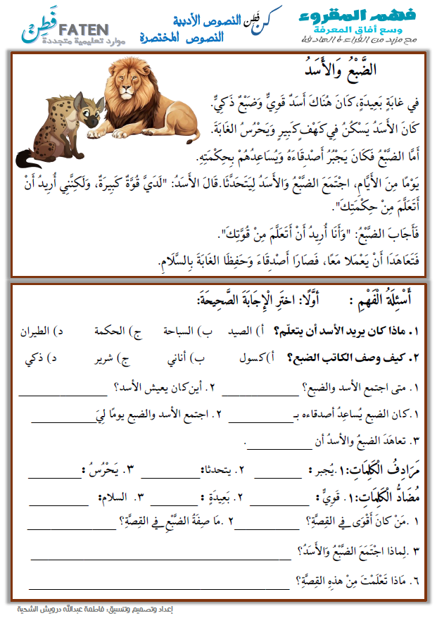 الضبع والأسداللغة العربية, النصوص الأدبية المختصرة / بواسطة alshihi@live.com الضبع والأسد تفاعلي FOMS ” أضغط هنا “ فهم المقروء للنصوص الأدبية المختصرة فهم المقروء للنصوص الأدبية المختصرة الضبع والأسدتنزيل