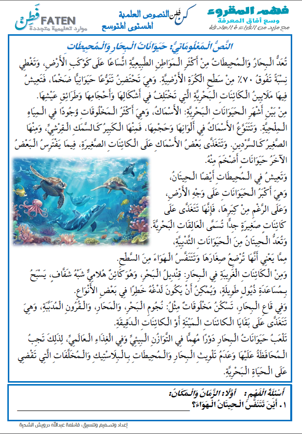 حيوانات البحار والمحيطاتاللغة العربية, النصوص العلمية الموسعة / بواسطة alshihi@live.com حيوانات البحار والمحيطات تفاعلي FOMS ” اضغط هنا “ فهم المقروء للنصوص العلمية الموسعة فهم المقروء للنصوص العلمية الموسعة حيوانات البحار والمحيطاتتنزيل