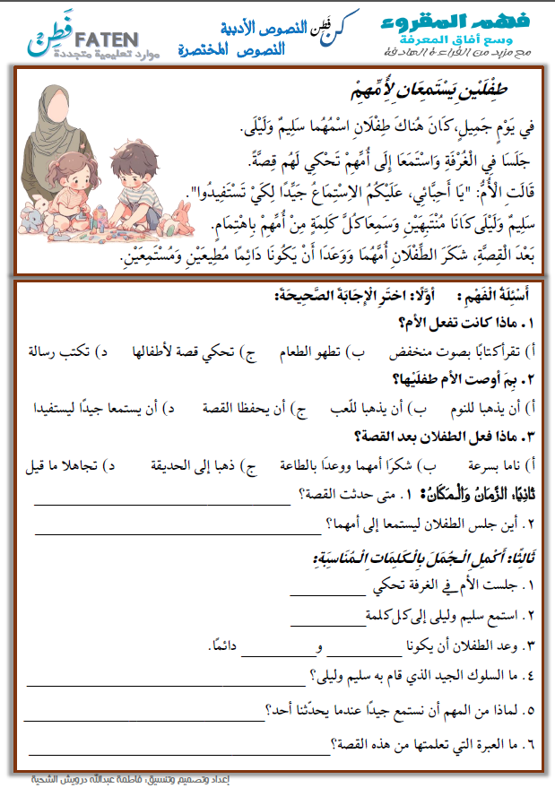 طفلين يستمعان لأمهمااللغة العربية, النصوص الأدبية المختصرة / بواسطة alshihi@live.com طفلين يستمعان لأمهما FOMS ” أضغط هنا ” فهم المقروء للنصوص الأدبية المختصرة فهم المقروء للنصوص الأدبية المختصرة طفلين يستمعان لأمهمتنزيل